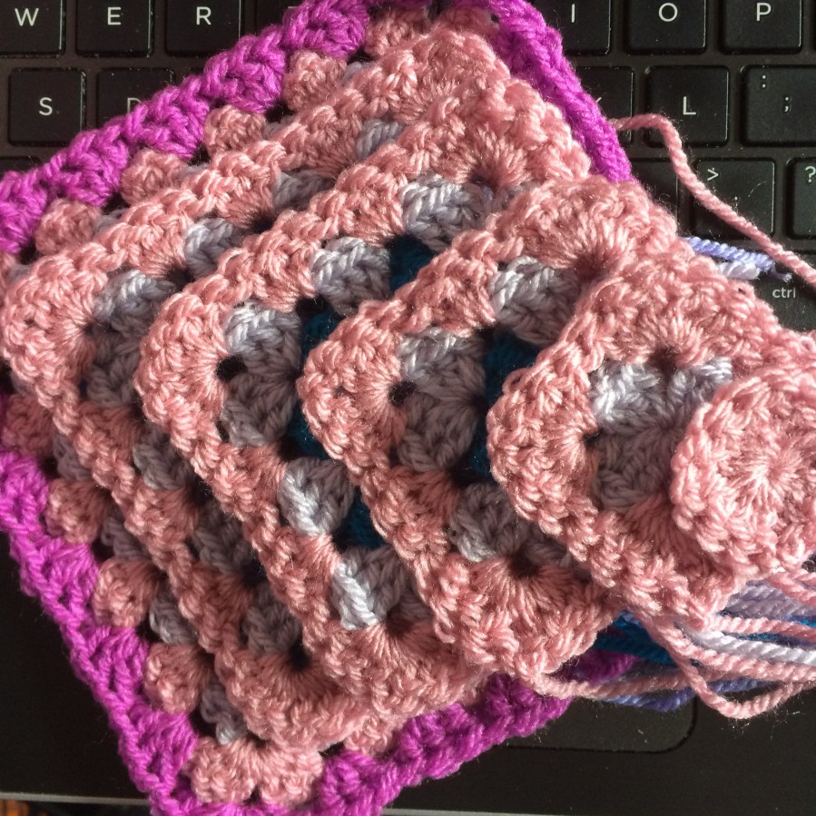 I start with just one centre – add the second colour and make another centre with that colour. Next comes the third colour – added to the 2 colour square, then the single centre and finally another centre is made. And so on. I find it more interesting and quicker to work – no sorting, and once the sequence is decided it’s a doddle to just keep it going. It’s easier to guage how much yarn is needed too. Once the cycle is finished it’s easy to work more individual squares – the first step is to simply reverse the order! A very quick and easy result. The ends are either woven in as I go – or when I settle down to watch an episode of Midsomer! I’ve seen them so many times I don’t need to concentrate too hard 😉