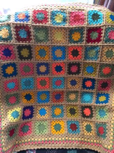 I finished the border, using the colours representing the most frequent temperatures of the month as contrast to the Summer joining colour for the Temperature Blanket, which was Camel. (I’ll be posting an update on that blanket tomorrow.) I have to admit that if I had chosen to work with these colours on another project I wouldn’t have considered Camel to join, but it ‘sort of’ works!