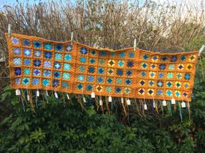 This is a quick post, just to show you the progress on the Temperature Blanket. Here is November joined to it’s Autumn fellows. It wasn’t easy to photograph, and this line wasn’t really the best place, but it will have to do