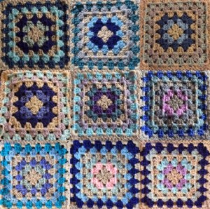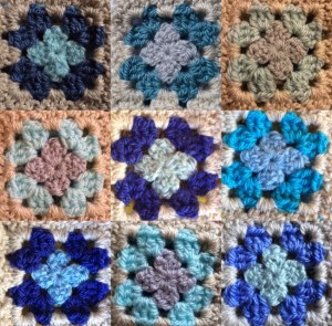 This year I’m making the temperature blanket in a slightly different way. Last year’s was made in monthly blocks – and these were joined into the seasons. I used 4 linking colours, but this year I’m only using one – and there will be no seasonal breaks. One long strip of granny blocks is a little boring, so instead, here is a block of nine days (a photo collage)