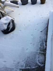 Other creatures ventured out. We were visited by a couple of foxes at least. I took this photo on the first morning, it wasn’t very thick then, and it was interesting to view their tracks and see their pathways. Their footmarks were very distinctive, we could see that there was more than one.
