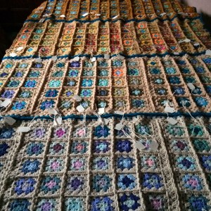 Well the time came to remove it. I’d also accumulated a supply of scrap lengths, all usable for Granny centres if nothing else, so I hatched a plan. 100 days ago I began the adventure that was ‘ Stashbusting Stone‘.