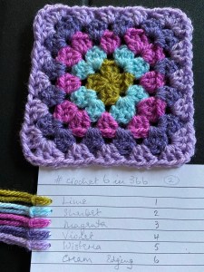 There were 48 squares in the last blanket. This second one will be bigger. There will be a total of 72 squares of six rounds. You can follow along, change the colours, or ‘do your own thing’. As before there are no crochet police – feel free to ‘go with the flow’. So this week there is only one square to describe.