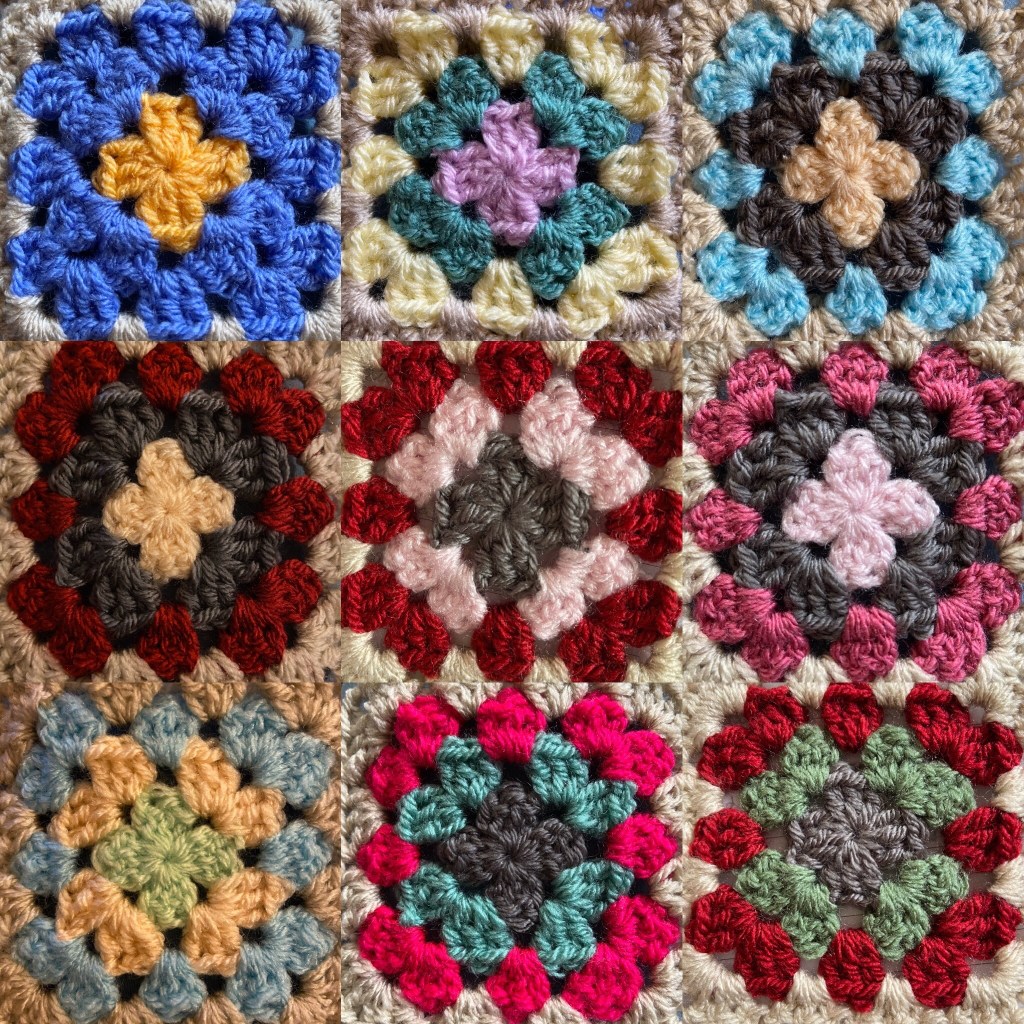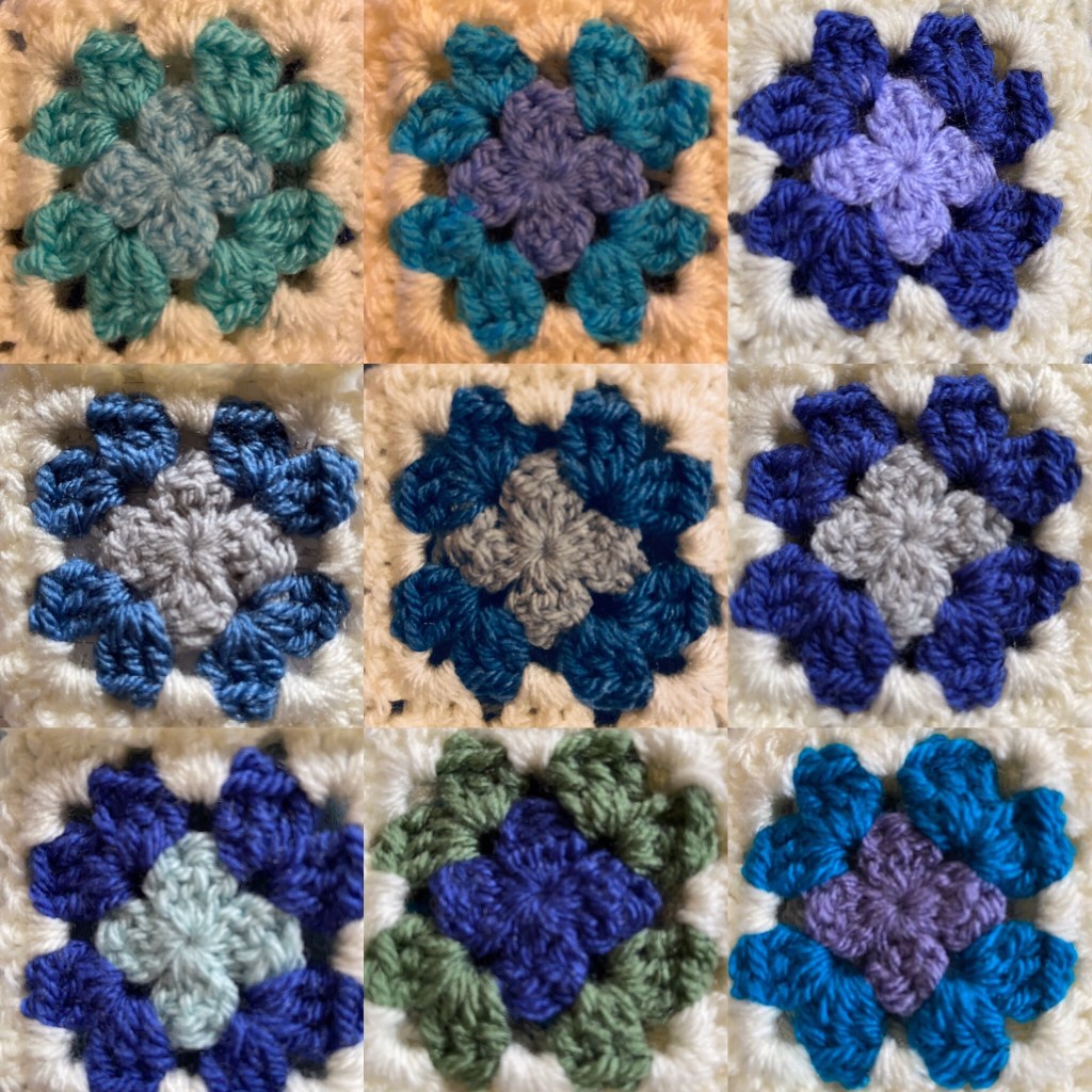 I have no control over the weather, but it’s been interesting to work on two of my current projects which are related, but not really intentionally so. Firstly the Spirit of Spring blanket is almost complete. Today’s square will finish the penultimate strip leaving just 9 squares to go. I’m also working on the ‘look up’ version that I mentioned at the beginning of the month. It will be 100 squares. The following pictures show the last nine squares of each.