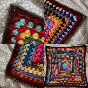 Blanket number three is next! It seems to have come around so quickly. This time my version will definitely be a scrap blanket and will have 63 squares. While some of the squares will be random colours some of them will use the remnants of others I’ve worked on this year. It will also feature a dark grey as the main colour. I seem to have a superfluity of dark grey – hardly surprising as it sets off well so many colours.