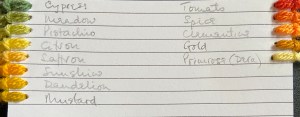 - July 26: Sunshine, Meadow, Pistachio, Dandelion, Saffron, Mustard, Gold