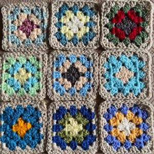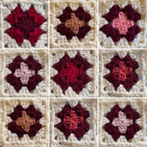 This blanket can be as large or small as you wish, so that may influence the size of each of the squares. You too will have (almost) complete control of the colour order. The squares can be a single colour or several.