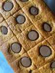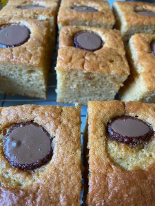 The funny looking brown bits are actually chocolate buttons. I had intended to pop a little Easter egg into the soft chocolate the moment it came out of the oven … but it didn’t melt, so no eggs!