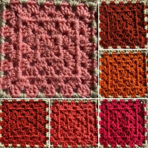 The layout was determined before I started this time, so the squares were made and joined in sequence. The border is plain and simple – just to finish the experiment. If you want to make something similar Two balls of Parchment were needed, and approximately 40g of each of the other colours.