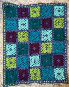 All squares completed using just one ball of each colour – but two balls of Blue Velveteen needed for centres, outer round and border. Only one ball of Peridot used including the splash of colour in the border.