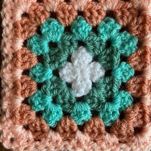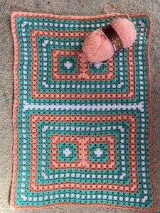 The sequence above continues – which will leave enough yarn for a two colour border. It was important that this edge was White and Apricot if your need is different – change the starting sequence to take this into consideration. So, to continue around the now joined rectangle.