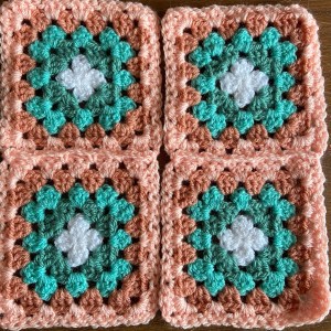 From this point the regular sequence differs from the first blankets. Continue in this sequence around both pairs of joined squares to form two modules.