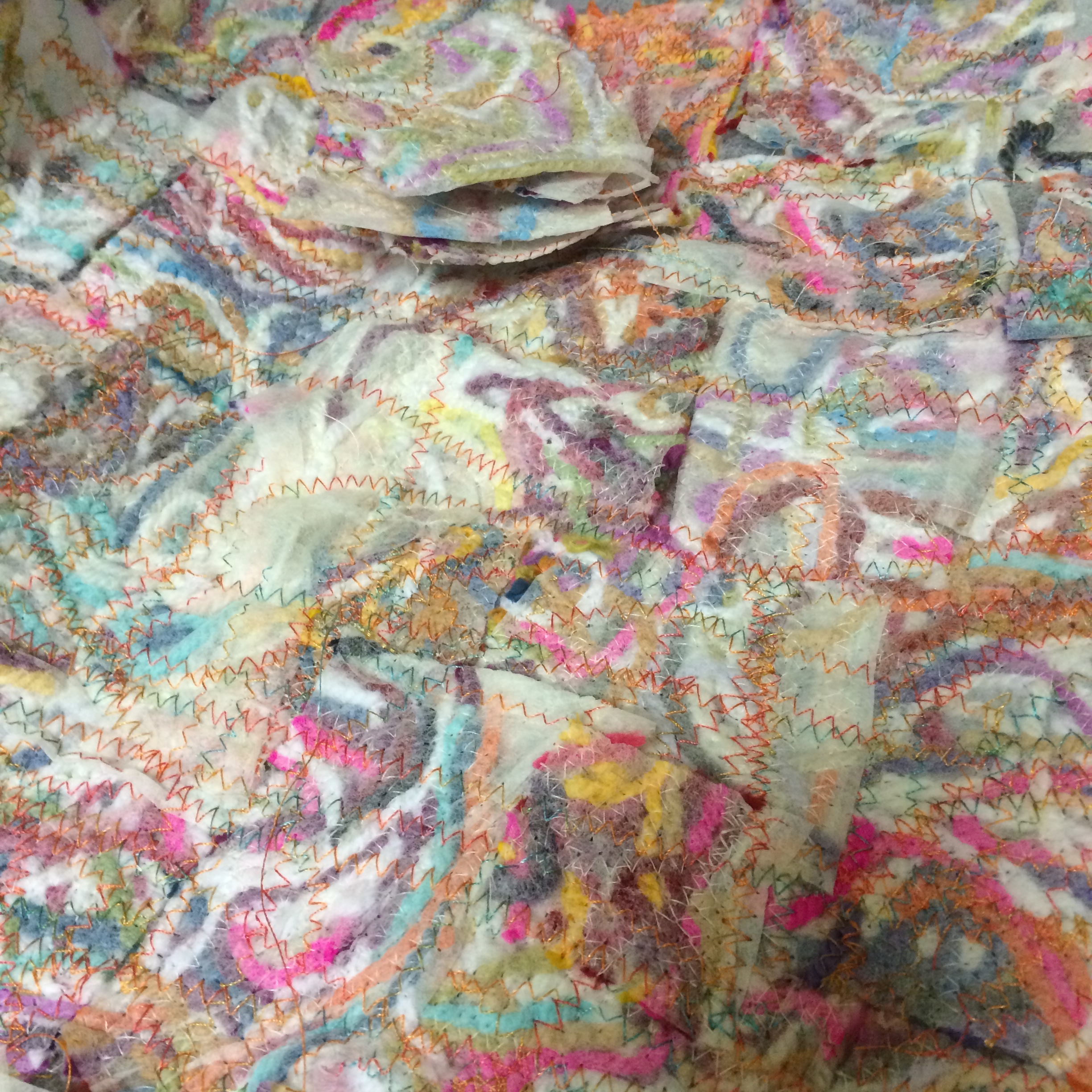 Time to use those extra squares.If you hold the stitching up to the light once you have stitched to the above stage you will be able to see any big gaps in the yarn. The surface doesn’t need to be densely covered – gaps are good – but big holes aren’t. Use the extra squares to cover them.