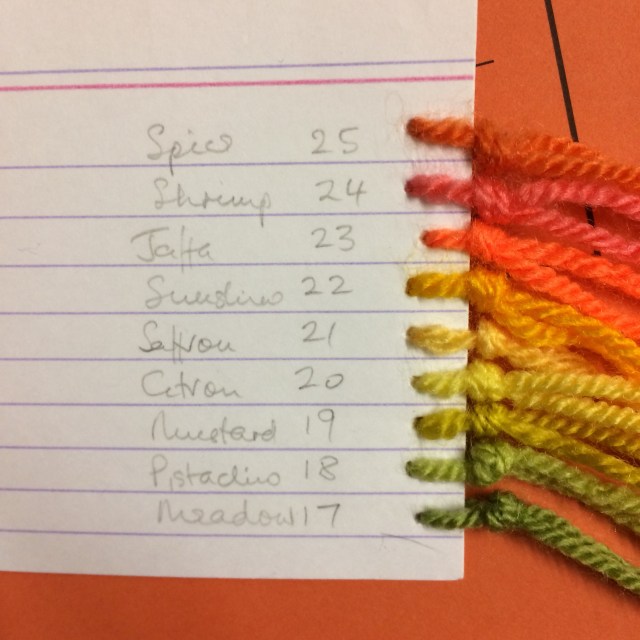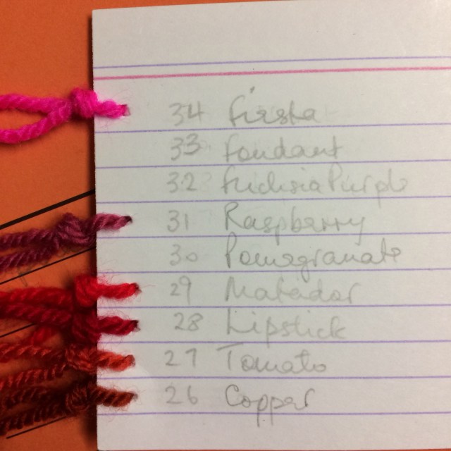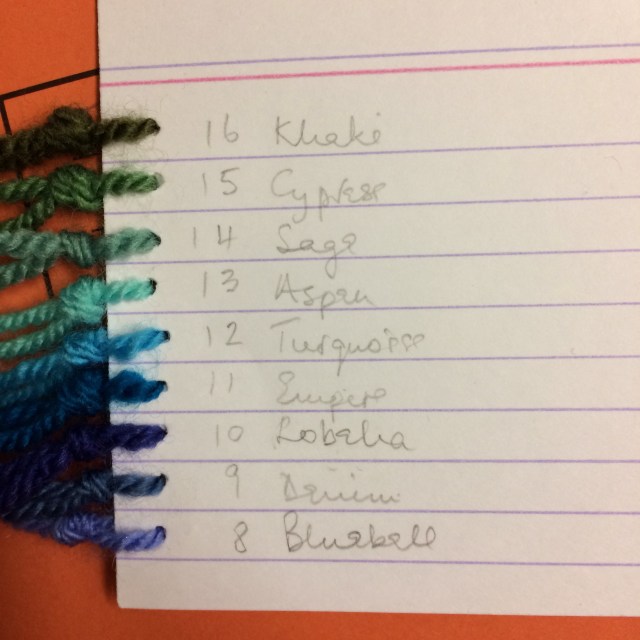 If you want to follow the progress of the squares I used to post them, but that site is no longer available. The yarns I used are below, the order runs from bottom to top of each card. You may wish to make your own collection.